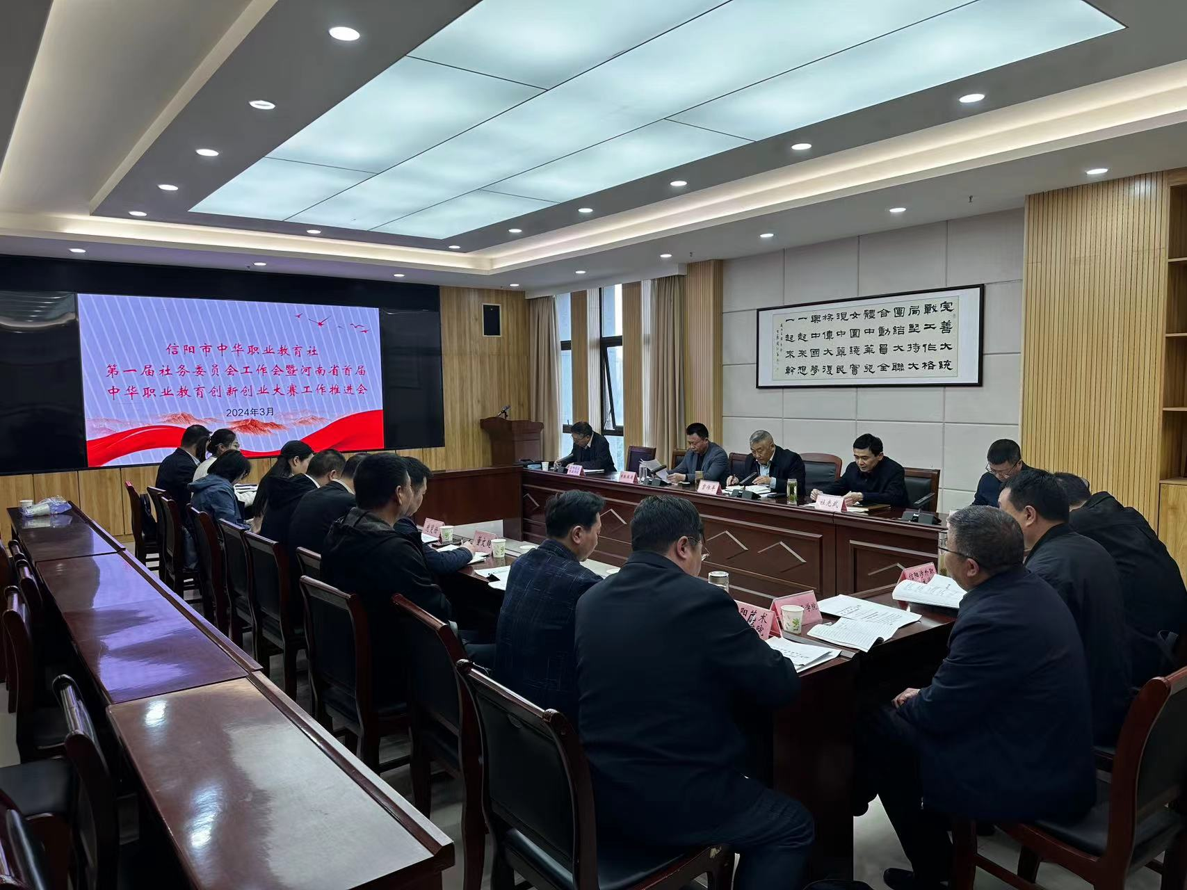 3月28日,信阳市中华职业教育社第一届社务委员会工作会暨河南省首届中华职业教育创新创业大赛工作推进会在市委统战部大会议室召开,市政协副主席、市中华职教社主任、民建信阳市委主委贾作平出席会议并讲话,市委统战部副部长、市中华职教社副主任杜光武主持会议。